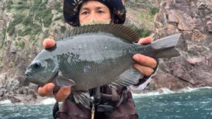 水道では昼前からウネリが弱まり何とか釣りが出来そうな感じに。賀久ちゃんが待望の1枚。クチブトの良型でした。