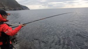 夜が明けるとスタート。釣り座は適当に決めました。とりあえず足元から。