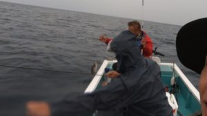 下潮は3人で結構釣りました。途中雨が降りましたが今日はカッパで完全装備。上げに変わり場所を変更しましたが、流れが那須さんの予定外の流れだったので釣果が伸びず…